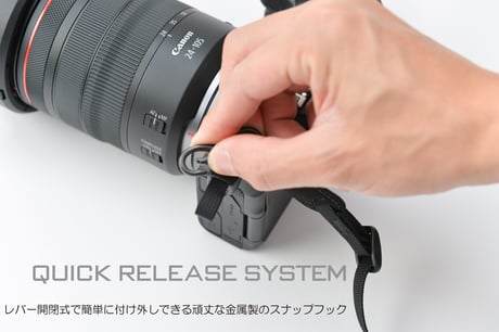 取り付けは至って簡単で、スナップジョイント(SNAPJOINT)をカメラ本体に装着し、あとは各自お使いのカメラストラップにスナップフックとスナップカバーを装着するだけの簡単取り付けで、無加工にて取り付け可能ですので手軽にカメラ本体とストラップのクイックリリースシステムを実現することができます (取り外しも同じく簡単に取り外すことができます) 。