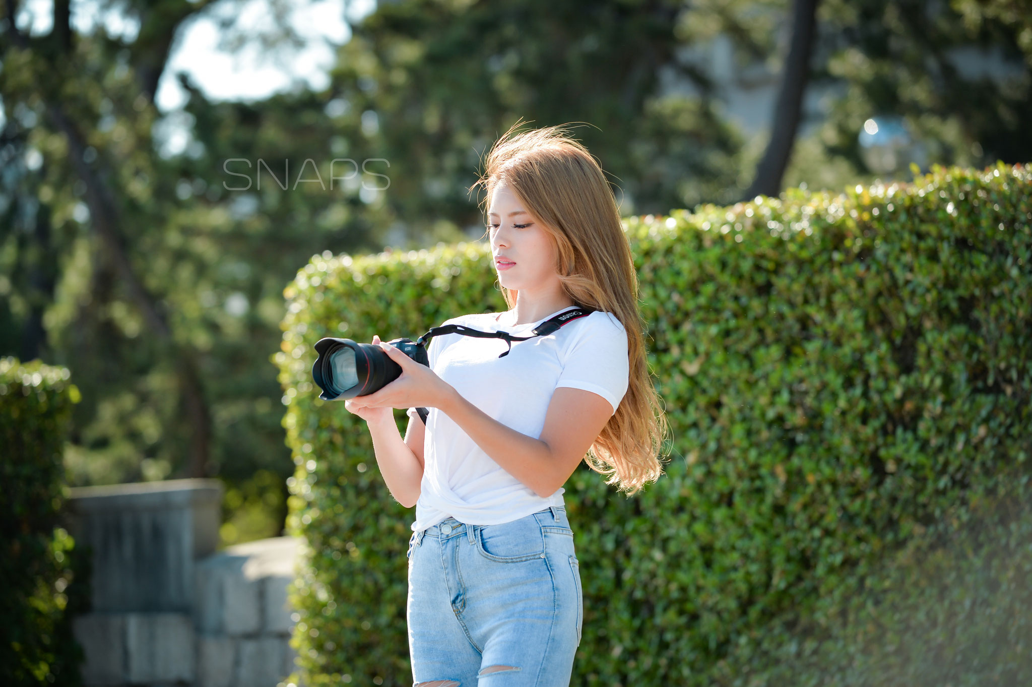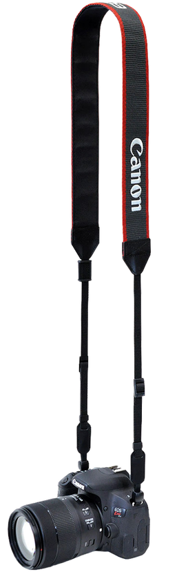 → ストラップを首掛けや肩掛けした状態で撮影する時には、カメラ位置の可動できる範囲が制限されてしまい、また一方で、ストラップを身体に掛け渡さずに撮影する時には、ストラップが下方に大きく垂れ下がるため