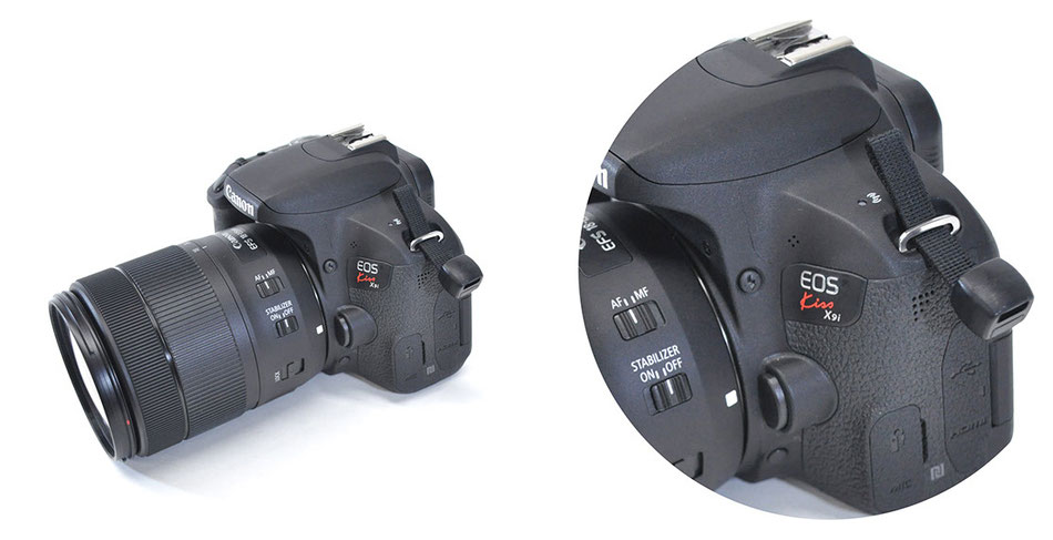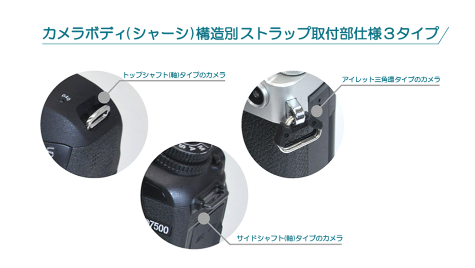 これを左右2箇所に取り付けて頂くことで、カメラ本体の両サイドに輪状の引っ掛け部が装備されます。
